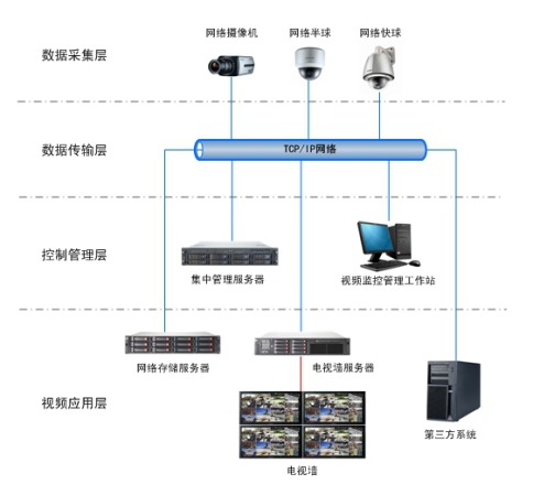 網(wǎng)絡(luò)視頻監(jiān)控系統(tǒng)由前端數(shù)據(jù)采集層、數(shù)據(jù)傳輸層、控制管理層、視頻應(yīng)用層四個(gè)部分組成。數(shù)據(jù)采集層由網(wǎng)絡(luò)攝像機(jī)或模擬攝像機(jī)+編碼器的方式組成,主要負(fù)責(zé)獲取視頻圖像。數(shù)據(jù)傳輸層由網(wǎng)絡(luò)交換機(jī)及傳輸線纜組成,其中網(wǎng)絡(luò)交換機(jī)負(fù)責(zé)數(shù)據(jù)交換。控制管理層由集中管理服務(wù)器與視頻監(jiān)控管理工作站組成,通過(guò)對(duì)視頻監(jiān)控管理工作站設(shè)置不同的權(quán)限,實(shí)現(xiàn)對(duì)不同權(quán)限的用戶管理。視頻應(yīng)用層由存儲(chǔ)轉(zhuǎn)發(fā)服務(wù)器、解碼服務(wù)器組成,主要負(fù)責(zé)制圖像轉(zhuǎn)發(fā)、存儲(chǔ)及視頻輸出。