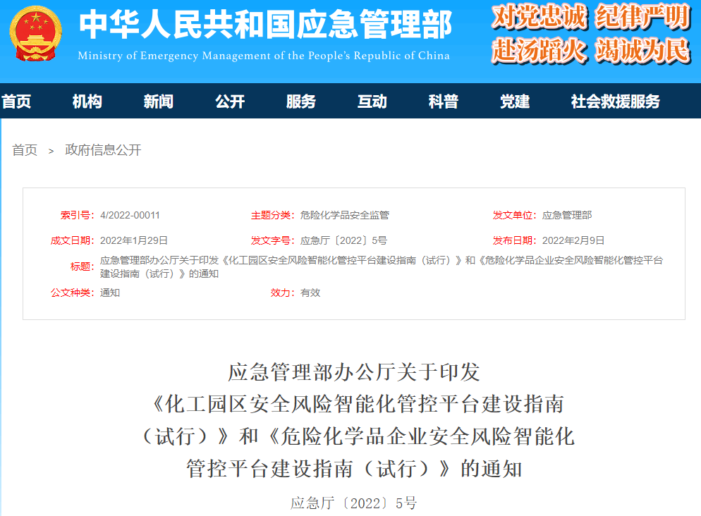 應(yīng)急管理部印發(fā)《化工園區(qū)安全風(fēng)險智能化管控平臺建設(shè)指南(試行)》和《危險化學(xué)品企業(yè)安全風(fēng)險智能化管控平臺建設(shè)指南(試行)》,以指導(dǎo)化工園區(qū)和危險化學(xué)品企業(yè)建平臺、用平臺,運用信息數(shù)字等先進(jìn)技術(shù)手段強(qiáng)化安全風(fēng)險防控能力,推動化工園區(qū)、危險化學(xué)品安全風(fēng)險管控數(shù)字化轉(zhuǎn)型、智能化升級。