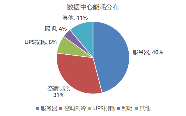 數(shù)據(jù)中心能耗是指數(shù)據(jù)中心各種用能設(shè)備消耗的能源總和,能耗消耗主要包括:服務(wù)器,交換機(jī),空調(diào),配電,安防,照明等系統(tǒng)。據(jù)一些數(shù)據(jù)統(tǒng)計(jì)報(bào)告,數(shù)據(jù)中心能耗大致分布如下:
