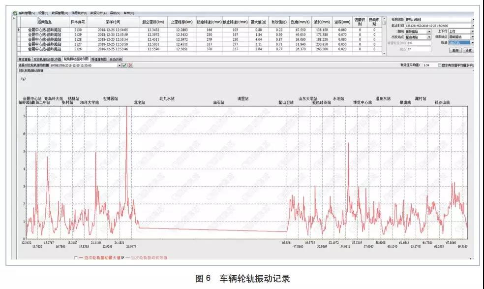 利用車載狀態(tài)監(jiān)測設(shè)備采集的車輛實(shí)時狀態(tài)數(shù)據(jù),并根據(jù)系統(tǒng)或部件的歷史監(jiān)控?cái)?shù)據(jù),對于專家系統(tǒng)給定閾值內(nèi)的數(shù)據(jù)抖動進(jìn)行變化趨勢分析和比對。圖 6 顯示了車輛走行部軸箱軸承狀態(tài)監(jiān)測設(shè)備在某運(yùn)行區(qū)間所記錄的 2 軸右軌振動數(shù)據(jù)。在圖中 K25+292~K25+400 區(qū) 間,最大振動有效值為 7.58g,波磨路段的振動頻率為400~450 Hz,未超出系統(tǒng)給定的正常狀態(tài)閾值,但相較于該軸的歷史數(shù)據(jù)記錄,本次振動幅度特別大,因此系統(tǒng)記錄下數(shù)據(jù)變化趨勢并發(fā)出報(bào)警信號,提示檢修人員檢查該部位走行部狀態(tài)。
