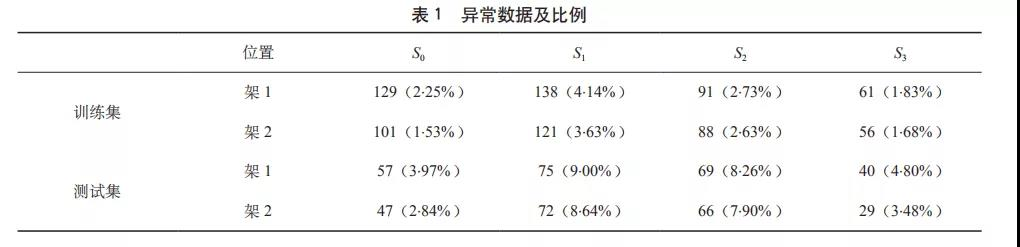 車輛智能專家診斷系統(tǒng)會提取影響車輛運(yùn)行狀態(tài)的關(guān)鍵數(shù)據(jù)指標(biāo)和過程變量,作為故障判定的主要參照,在采集所有的狀態(tài)數(shù)據(jù)后,對車輛或系統(tǒng)狀態(tài)對應(yīng)時間窗內(nèi)的所有模擬量數(shù)據(jù)進(jìn)行統(tǒng)計(jì),提取區(qū)段最大值、最小值、平均值和平均差等不同參數(shù)作為區(qū)間特征值進(jìn)行數(shù)據(jù)重組。然后,將同一車架的同一類車輛或設(shè)備狀態(tài)數(shù)據(jù)作為學(xué)習(xí)樣本,采用無監(jiān)督機(jī)器學(xué)習(xí)算法對所得數(shù)據(jù)進(jìn)行異常檢測。整個數(shù)據(jù)集按照適當(dāng)?shù)谋壤指顬橛?xùn)練數(shù)據(jù)集和測試數(shù)據(jù)集,用相應(yīng)的算法進(jìn)行驗(yàn)證測試,如表 1 所示。