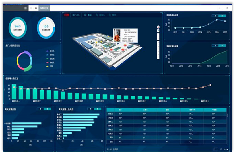 基于企業(yè)安全和日常業(yè)務(wù)管理的各類型數(shù)據(jù)統(tǒng)計(jì)分析,如:各區(qū)域人數(shù)分布熱度、報(bào)警事件數(shù)量、高發(fā)類型及時(shí)間段分析、各類工作的達(dá)標(biāo)率等,為廠區(qū)管理升級(jí)提供有力的數(shù)據(jù)支撐;