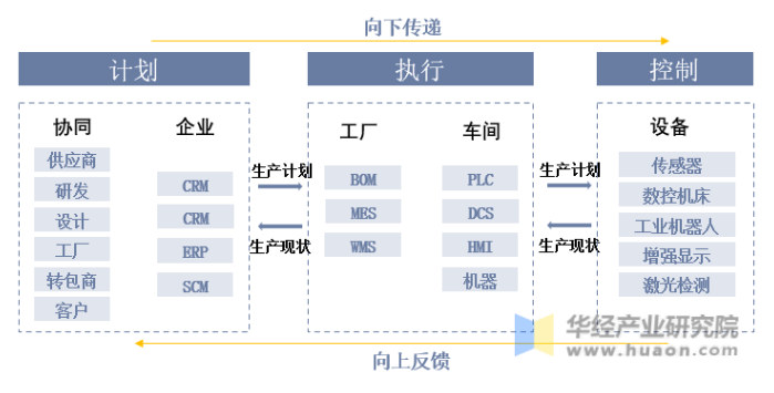 智能工廠包含三項流程,可再細分為五個層面,層與層之間相互聯(lián)系,形成閉環(huán)。計劃流程包括協(xié)同層和企業(yè)層,其中協(xié)同層指在商業(yè)生態(tài)環(huán)境中,企業(yè)與其他參與者進行互動,將各自的實時數(shù)據(jù)上傳至共享平臺,形成數(shù)據(jù)庫,企業(yè)層指企業(yè)內(nèi)部的生產(chǎn)管理軟件從共享平臺獲取數(shù)據(jù)并進行分析,展開預(yù)測性分析,制定工作計劃并排產(chǎn),向下傳達至執(zhí)行部門;執(zhí)行層主要負責(zé)接發(fā)生產(chǎn)任務(wù)并執(zhí)行;控制層主要對對生產(chǎn)設(shè)備進行實時監(jiān)控與中期檢測,保證產(chǎn)品質(zhì)量,協(xié)助必要維修工作。