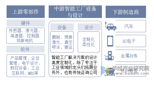 智能工廠產(chǎn)業(yè)鏈由上游的硬件及軟件廠商、中游的智能設(shè)備制造及方案設(shè)計供應(yīng)商、下游的制造企業(yè)三部分共同組成,下游需求帶動智能工廠擴大布局。