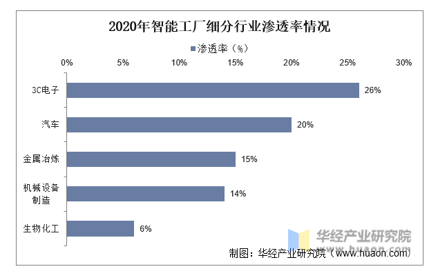 目前智能工廠整體滲透率較為不均,汽車和3C電子產(chǎn)品的下游產(chǎn)業(yè)市場化程度較高,整體滲透率水平較高,2020年分別為26%和20%左右,金屬冶煉、生物化工上游技術(shù)更新較慢,加之材料和品種復(fù)雜,整體工廠設(shè)計制造和硬件組件品類眾多且對效率要求較低,整體滲透率膠體