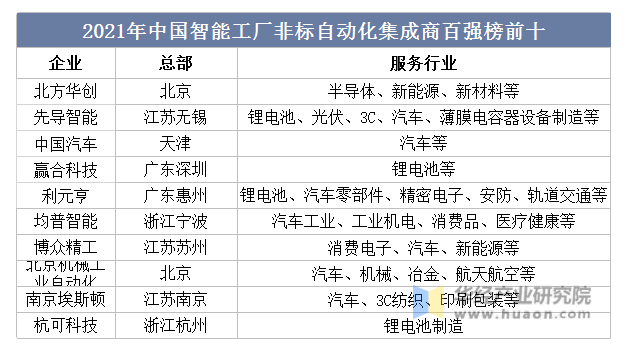 2021年中國智能工廠非標(biāo)自動化集成商百強榜前十