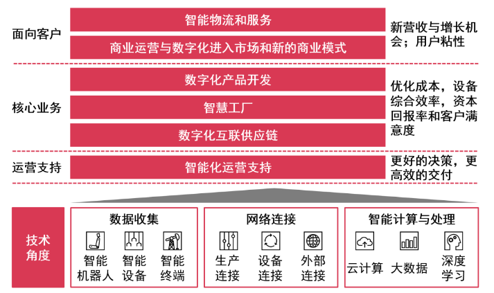 有別于前三次工業(yè)創(chuàng)新與進步,主要依賴單一技術突破拉動生產力形成爆發(fā)式增長。工業(yè)4.0通過實時數(shù)據采集、工業(yè)互聯(lián)網、智能計算與處理等多種技術,賦能產品研發(fā)、生產制造、供應鏈、營銷與服務等企業(yè)關鍵經營活動。在面向客戶的前端業(yè)務層,新技術持續(xù)推動新商業(yè)模式實踐,助力企業(yè)探索新增長、新機會;并通過精準用戶運營,鎖定優(yōu)質目標客戶,提升客戶粘性。核心業(yè)務層基于不同行業(yè)特征與差異化需求,通過數(shù)字化產品開發(fā)提速新產品研發(fā)與迭代,并結合新技術應用,提升生產與供應鏈運營的自動化、數(shù)字化和智能化水平,實現(xiàn)運營成本、設備綜合效率以及資本回報率的多維度優(yōu)化,在推動運營效率升級的同時持續(xù)提升客戶滿意度。在后端運營支持層,通過數(shù)據流打通,實現(xiàn)企業(yè)管理的實時可視化,結合智能化實時數(shù)據分析,為企業(yè)提供分析決策支撐,提升決策效率與質量。