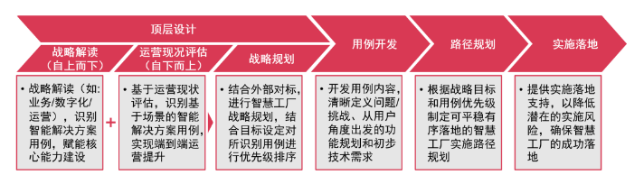 智慧工廠戰(zhàn)略規(guī)劃,需要自上而下,通過對企業(yè)業(yè)務、運營、數(shù)字化戰(zhàn)略,以及生產制造策略的解讀,明確賦能工廠發(fā)展核心能力建設的智能解決方案用例;并自下而上,通過運營現(xiàn)狀評估,設計包含流程、系統(tǒng)和管控機制等優(yōu)化舉措以及通過智能解決方案用例進一步賦能端到端運營的提升方案;結合自上而下、自下而上的內部評估,以及外部行業(yè)智慧工廠領先實踐對標,規(guī)劃可支持核心能力建設與運營優(yōu)化的智慧工廠戰(zhàn)略,結合階段目標設定,對所識別用例進行優(yōu)先級排序。
