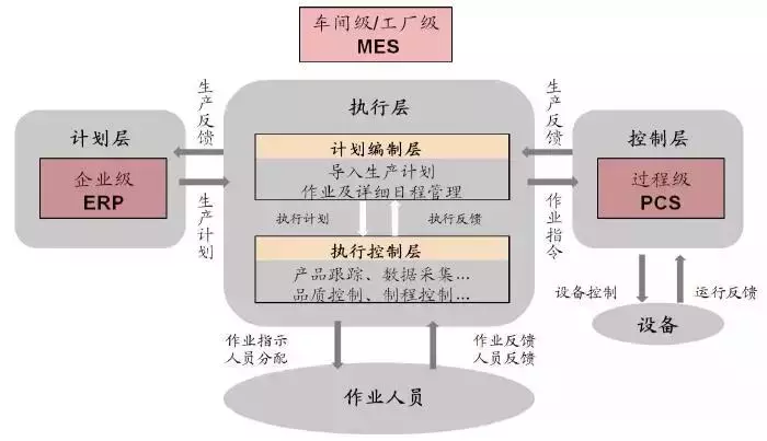 智慧工廠擁有三個層次的基本架構(gòu),分別為頂層的計劃層、中間層的執(zhí)行層以及底層的設(shè)備控制層,大致可對應(yīng)為ERP系統(tǒng)(企業(yè)資源計劃)、MES系統(tǒng)(制造執(zhí)行系統(tǒng))以及PCS系統(tǒng)(過程控制系統(tǒng))。