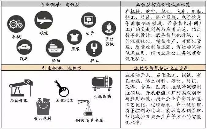 按MES系統(tǒng)的分類,智慧工廠的下游行業(yè)可粗略地劃分為離散型與流程型。其中,離散型行業(yè)主要包括機械、航空航天、汽車等,流程性行業(yè)主要包括石油化工、生物醫(yī)藥、食品飲料、紡織等。