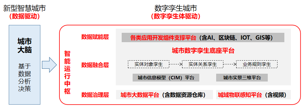 數(shù)字孿生城市是新型智慧城市建設(shè)新模式。智慧城市建設(shè)模式是不斷發(fā)展演化的,與上一階段智慧城市建設(shè)相比,內(nèi)容形式上,數(shù)字孿生城市建設(shè)更加注重城市全實體要素數(shù)字化表達,并針對全實體要素進行全方位數(shù)據(jù)融合,在多源數(shù)據(jù)深度融合基礎(chǔ)上,系統(tǒng)性整體性重塑和實現(xiàn)城市“三融五跨”智慧應(yīng)用場景;技術(shù)能力上,除了云計算、大數(shù)據(jù)、AI、IOT等技術(shù),數(shù)字孿生城市更注重通過GIS、BIM、IOT、仿真、VR/AR等多技術(shù)引擎集成加持,實現(xiàn)城市運行動態(tài)感知、虛擬空間可視再現(xiàn)、智能分析仿真推演等能力。