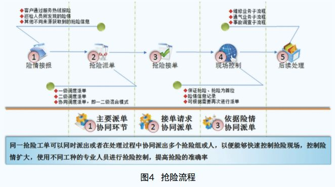如何構(gòu)建多元的險(xiǎn)情來(lái)源體系?如何確保信息傳遞的準(zhǔn)確性?如何確保搶險(xiǎn)過(guò)程的合規(guī)高效可靠?這是智慧搶險(xiǎn)所面臨的問(wèn)題。為解決上述問(wèn)題,有必要建設(shè)智慧化的搶險(xiǎn)維修系統(tǒng),實(shí)現(xiàn)對(duì)整個(gè)搶險(xiǎn)維修工作的智能管理。圖4是搶險(xiǎn)流程說(shuō)明。