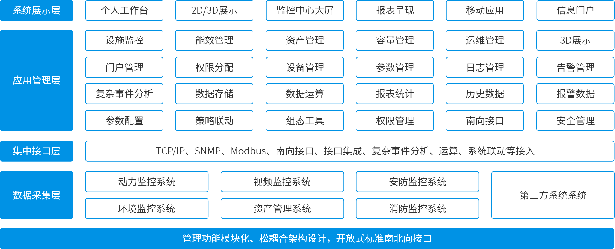 數(shù)據(jù)中心智能監(jiān)控?cái)?shù)字化解決方案為數(shù)據(jù)中心的決策者、管理者和使用者提供高效、優(yōu)質(zhì)的服務(wù);通過(guò)平臺(tái)軟件將數(shù)據(jù)中心及園區(qū)各個(gè)子系統(tǒng)做到統(tǒng)一管理,綜合規(guī)劃;對(duì)各個(gè)子系統(tǒng)進(jìn)行有效的監(jiān)視、控制和自動(dòng)化管理,實(shí)現(xiàn)集中管理,分散控制;協(xié)調(diào)各子系統(tǒng)之間的相互聯(lián)動(dòng)關(guān)系,具備全局事件處理能力,完成相關(guān)的系統(tǒng)聯(lián)動(dòng)控制;采集、處理、存儲(chǔ)各種相關(guān)數(shù)據(jù),實(shí)現(xiàn)資源共享;提供信息檢索、分析、顯示圖表,生成報(bào)表、打印報(bào)表等管理功能,為管理人員提供有力的科學(xué)決策支持。該產(chǎn)品可廣泛應(yīng)用于各大中型機(jī)房或企業(yè)的IDC機(jī)房、也可應(yīng)用于各運(yùn)營(yíng)商的通信機(jī)樓、數(shù)據(jù)機(jī)房、交換機(jī)房等,實(shí)現(xiàn)統(tǒng)一監(jiān)控、管理、運(yùn)營(yíng)分析,實(shí)現(xiàn)數(shù)據(jù)中心運(yùn)維自動(dòng)化,提升運(yùn)維工作效率,節(jié)省運(yùn)維成本,降低能耗,保障數(shù)據(jù)中心的可用性。